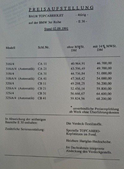 Das Fahrzeug mit der BAUR-Nr 228 (von 310) wurde im Juli 1993 bei der Fa. BAUR in Stuttgart umgebaut und an ein Autohaus in Gießen geliefert. Eine Auslieferungsliste mit Zubehörkennung / Rechnung der Fa. BAUR an das Autohaus Würtele in Gießen ist vorhanden.Erst am 20.6.1995 wurde das Fahrzeug verkauft.Rechnung an Erstbesitzer vorhanden. Seit Oktober 2008 ist der Wagen bei mir in 4. Hand und bis auf die hinteren Lampengläser (weiße Blinker) Originalzustand.
