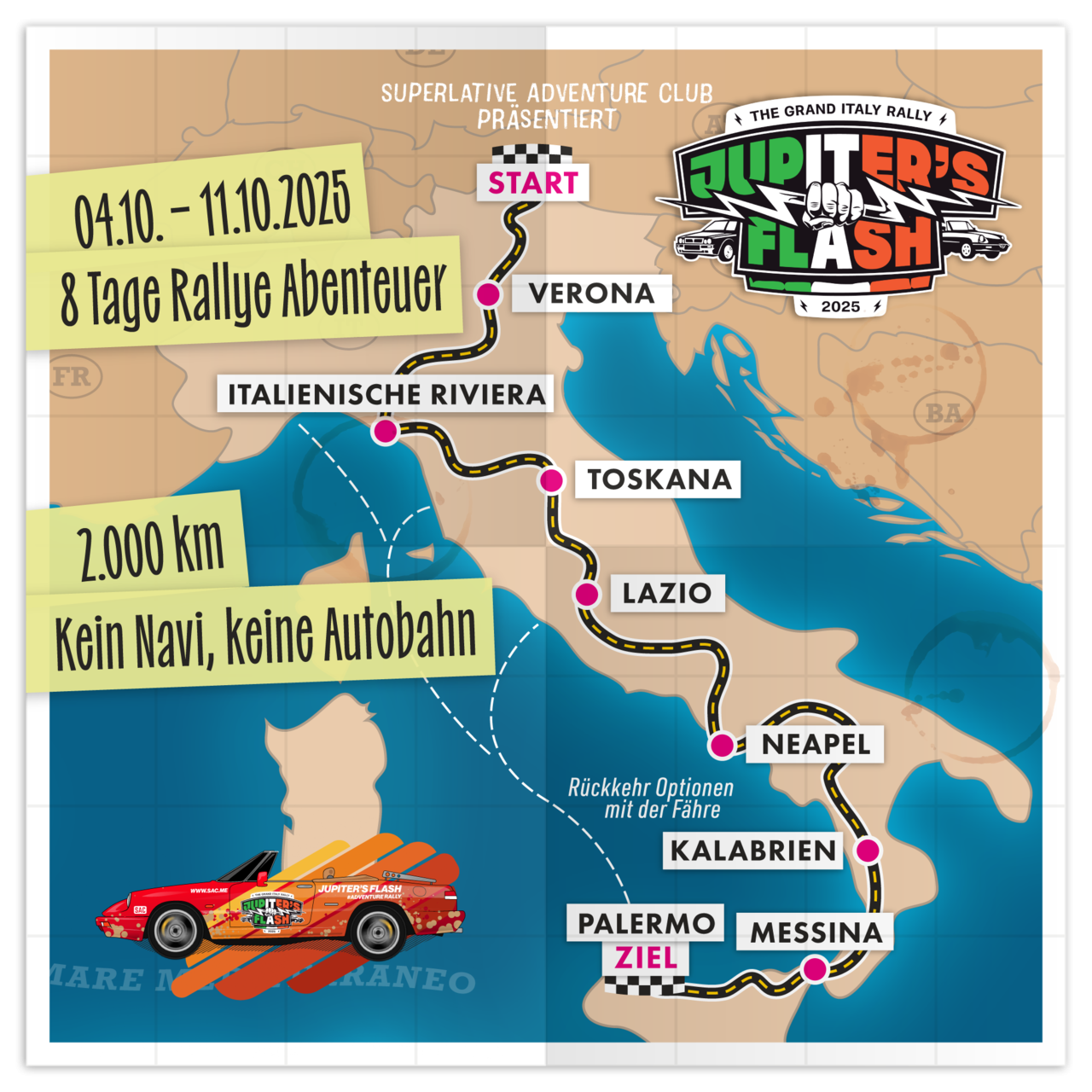 Der Start erfolgt im Ötztal/Tirol über ca. 2000km spektakulären Nebenstrecken bis nach Palermo/Sizilien.